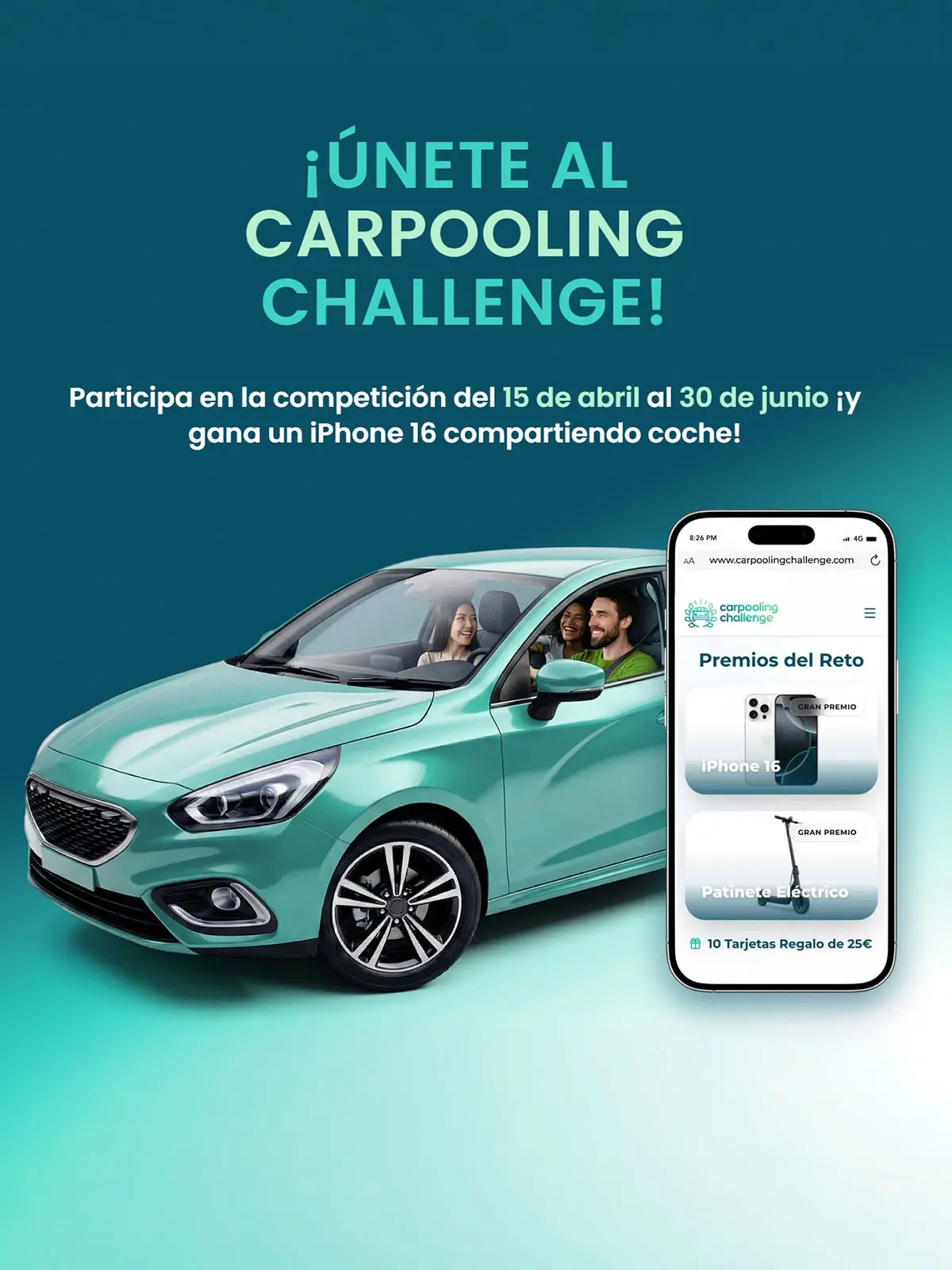 ✅ Puedes ganar premios: Si registras al menos 300 km compartiendo coche, entrarás en el sorteo de grandes premios como: Un iPhone 16, un patinete eléctrico o 10 Tarjetas Regalo de 25€