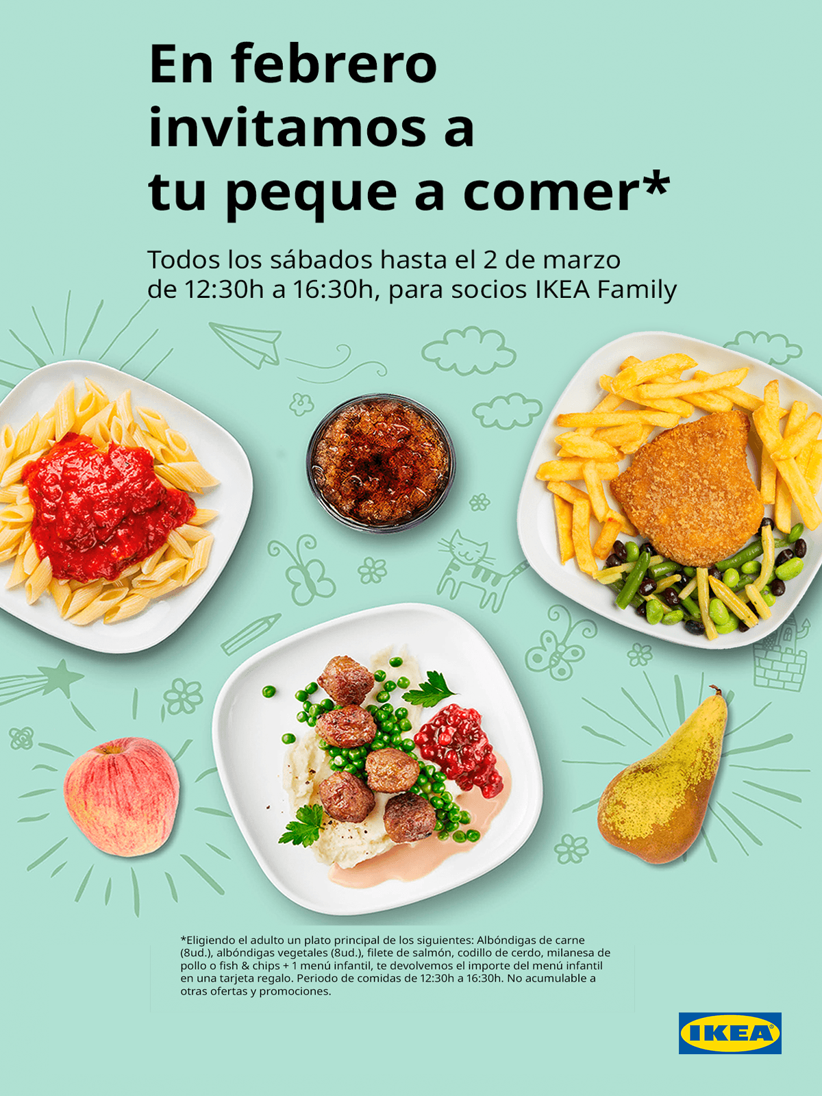 *Eligiendo el adulto un plato principal de los siguientes: Albóndigas de carne (8ud.), albóndigas vegetales (8ud.), filete de salmón, codillo de cerdo, milanesa de pollo o fish & chips + 1 menú infantil, te devolvemos el importe del menú infantil en una tarjeta regalo. Periodo de comidas de 12:30h a 16:30h. No acumulable a otras ofertas y promociones.