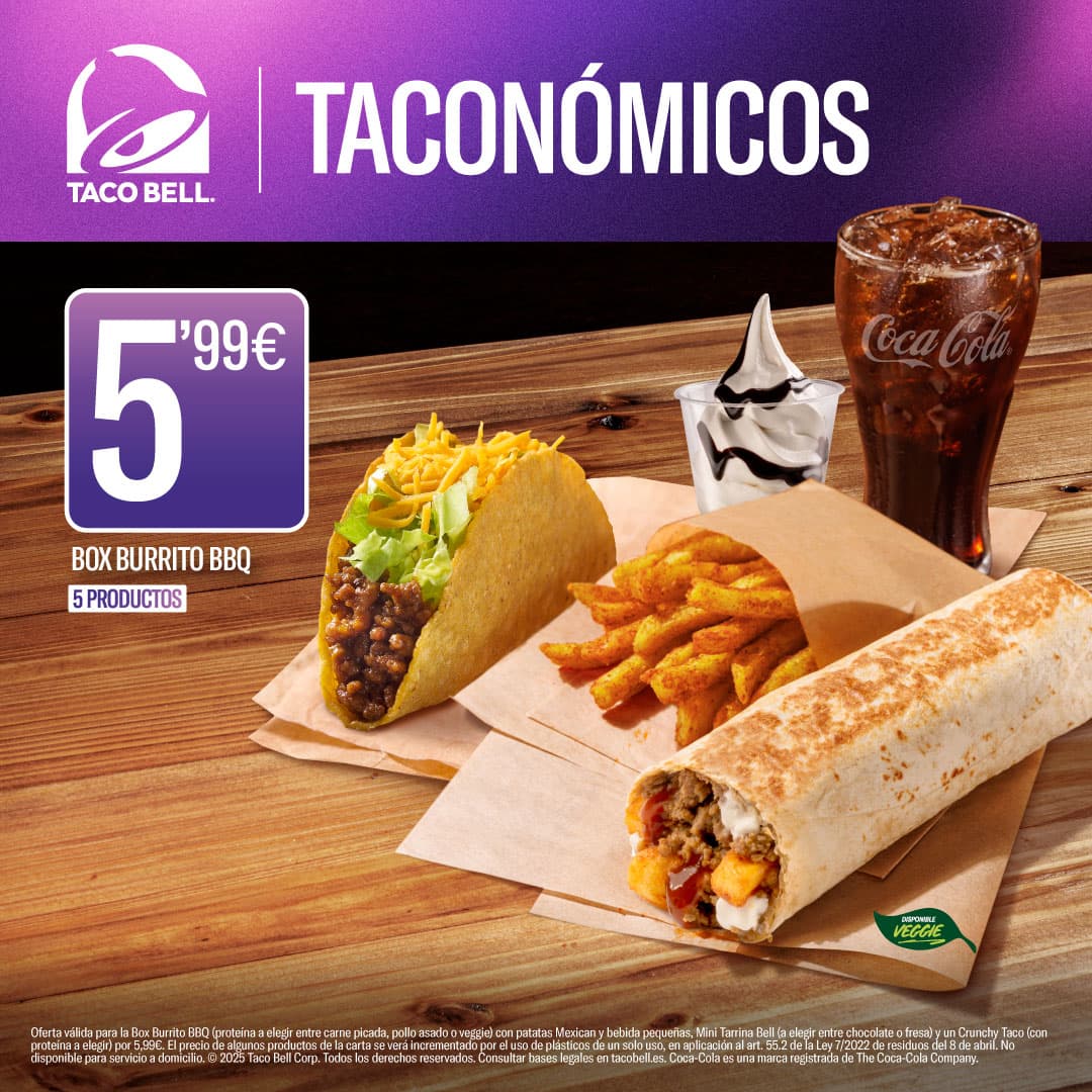 *Menú Beefries (con una de proteína a elegir entre carne picada, pollo asado o veggie) con complemento y bebida pequeños por 3,50€. El precio de algunos productos de la carta se verá incrementado por el uso de plásticos de un solo uso, en aplicación al art. 55.2 de la Ley 7/2022 de residuos del 8 de abril. No disponible para servicio a domicilio. © 2024 Taco Bell Corp. Todos los derechos reservados. Consultar bases legales en tacobell.es. Coca-Cola es una marca registrada de The Coca-Cola Company.