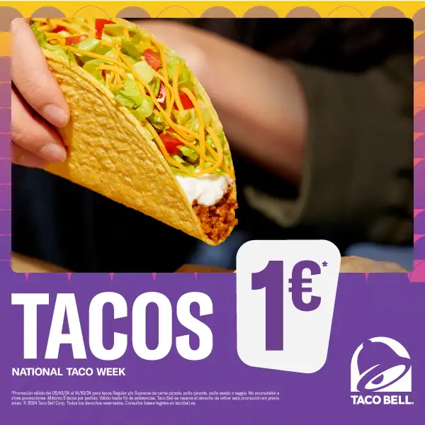 *Promoción válida del 05/10/24 al 14/10/24 para tacos Regular y/o Supreme de carne picada, pollo picante, pollo asado o veggie. No acumulable a otras promociones. Máximo 5 tacos por pedido. Válido hasta fin de existencias. Taco Bell se reserva el derecho de retirar esta promoción sin previo aviso. © 2024 Taco Bell Corp. Todos los derechos reservados. Consultar bases legales en tacobell.es