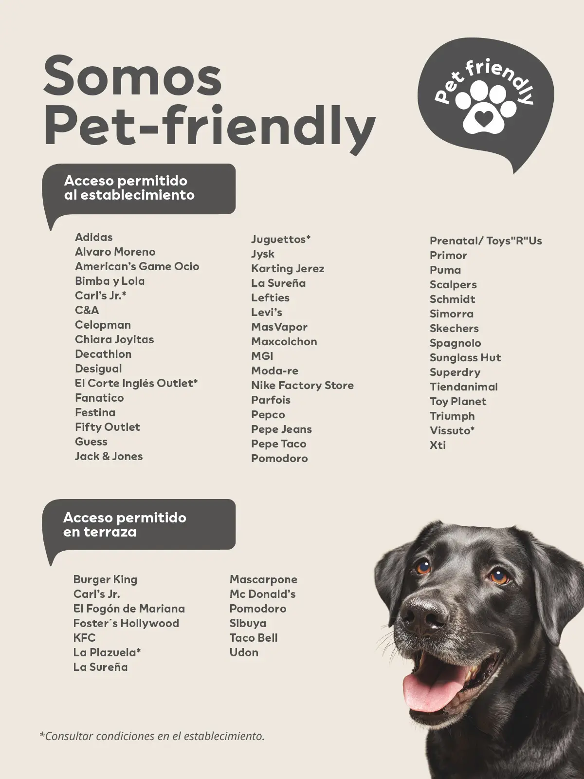 Ahora ven y visita con vuestros mejores amigos muchos de nuestros establecimientos, sin olvidar que también tenemos un rincón muy especial para ellos, nuestra Doggy Zone. Os esperamos a todos con los brazos abiertos porque... ¡SOMOS PET-FRIENDLY! Consulta las tiendas adheridas más abajo.